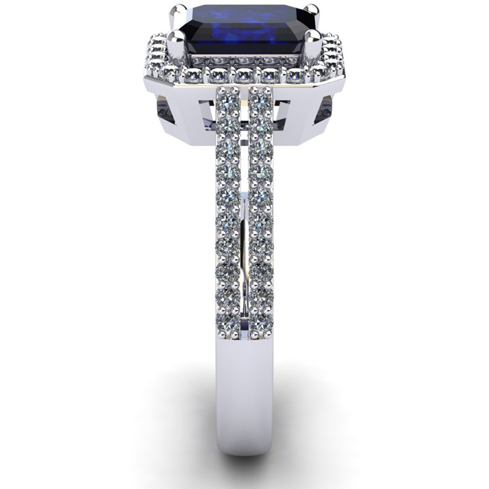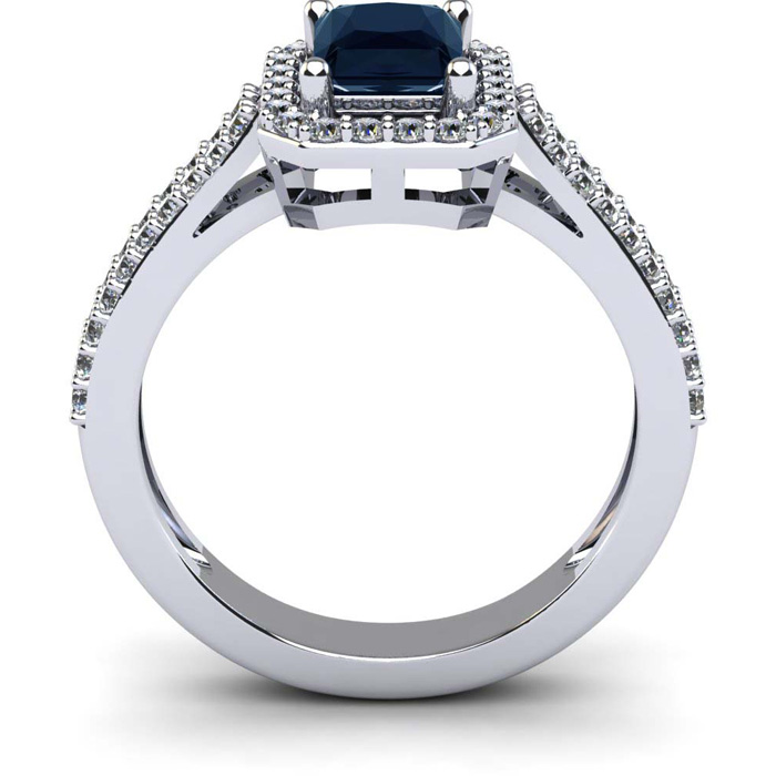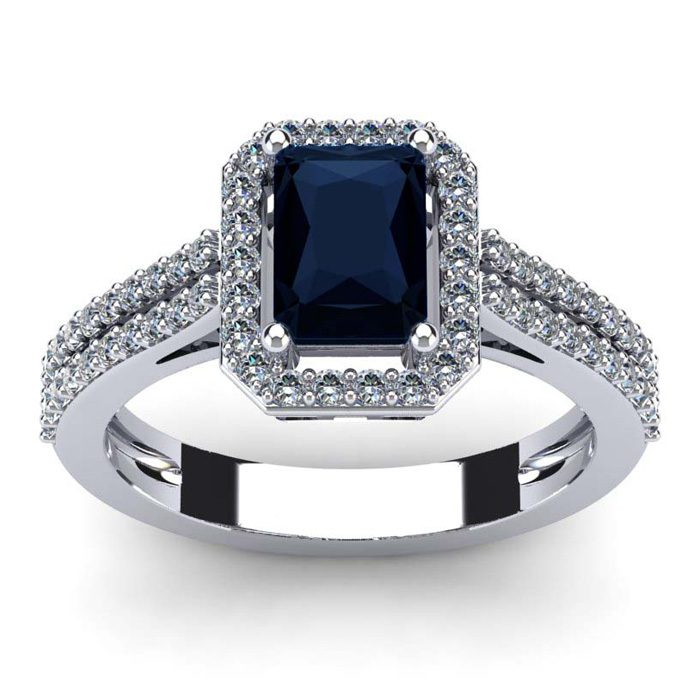 This stunning gemstone and diamond ring features one 7x5mm emerald cut sapphire gemstone at 1.05 carats. It is surrounded by 56 sparkling diamonds in a halo in I-J color, I1-I2 clarity at 0.42 carats. Total gem weight is 1.47 carats. This ring is crafted in 14 karat white gold.