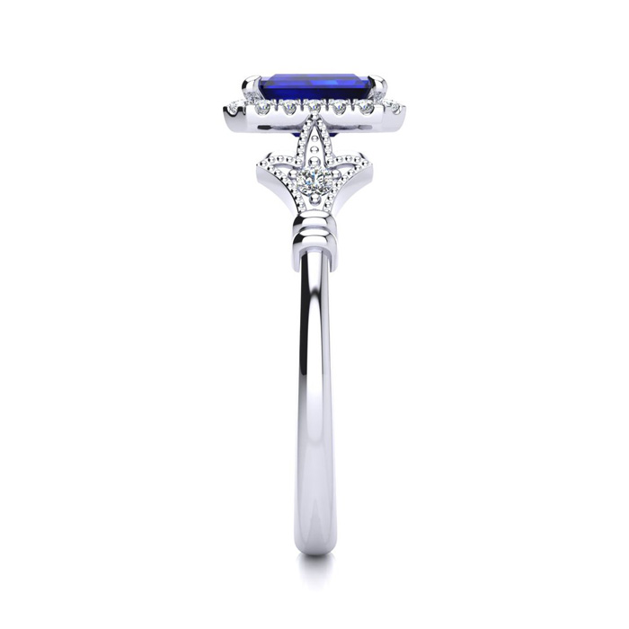 This stunning gemstone and halo diamond vintage ring features one 7x5mm emerald cut sapphire gemstone at 1.15 carats. It is surrounded by 22 sparkling diamonds in a halo and down the band in H-I color, I1-I2 clarity at 0.25 carats. Total gem weight is 1.40 carats. This ring is crafted in 14 karat white gold. *Retrograde Birthstones™ flips the idea of traditional birthstones. Wear your ½ birthday birthstone, your Retrograde Birthstone, “The Birthstone For Your Bad Side™.