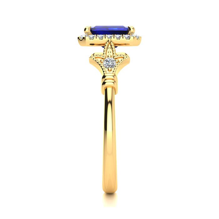 This stunning gemstone and halo diamond vintage ring features one 7x5mm emerald cut sapphire gemstone at 1.15 carats. It is surrounded by 22 sparkling diamonds in a halo and down the band in H-I color, I1-I2 clarity at 0.25 carats. Total gem weight is 1.40 carats. This ring is crafted in 14 karat yellow gold. *Retrograde Birthstones™ flips the idea of traditional birthstones. Wear your ½ birthday birthstone, your Retrograde Birthstone, “The Birthstone For Your Bad Side™.