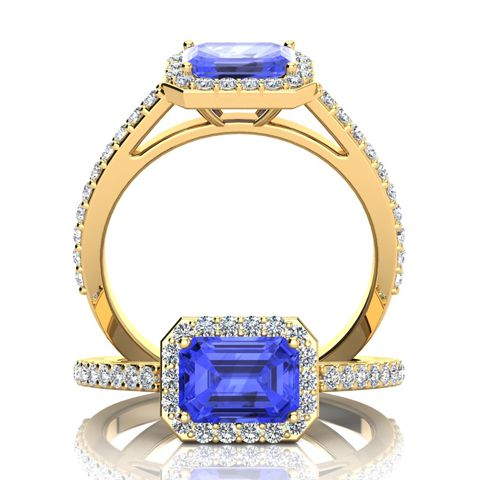 This stunning gemstone and halo diamond ring features one 7x5mm emerald shape tanzanite gemstone at 1.15 carats. It is surrounded by 42 sparkling diamonds in a halo and down the band in H-I color, I1-I2 clarity at 0.31 carats. Total gem weight is 1.46 carats. This ring is crafted in 14 karat yellow gold.