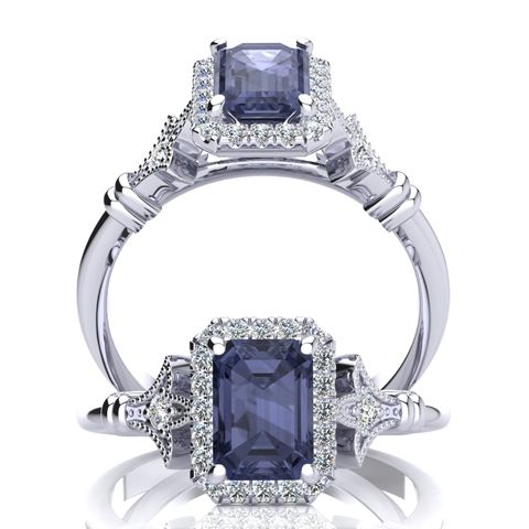 This stunning gemstone and halo diamond vintage ring features one 7x5mm emerald cut tanzanite gemstone at 1.15 carats. It is surrounded by 22 sparkling diamonds in a halo and down the band in H-I color, I1-I2 clarity at 0.25 carats. Total gem weight is 1.40 carats. This ring is crafted in 14 karat white gold.