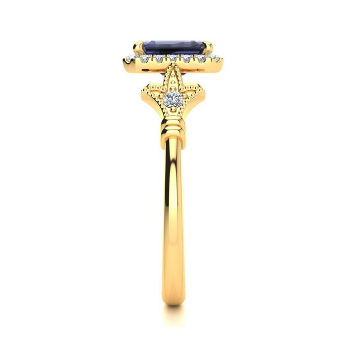 This stunning gemstone and halo diamond vintage ring features one 7x5mm emerald cut tanzanite gemstone at 1.15 carats. It is surrounded by 22 sparkling diamonds in a halo and down the band in H-I color, I1-I2 clarity at 0.25 carats. Total gem weight is 1.40 carats. This ring is crafted in 14 karat yellow gold.