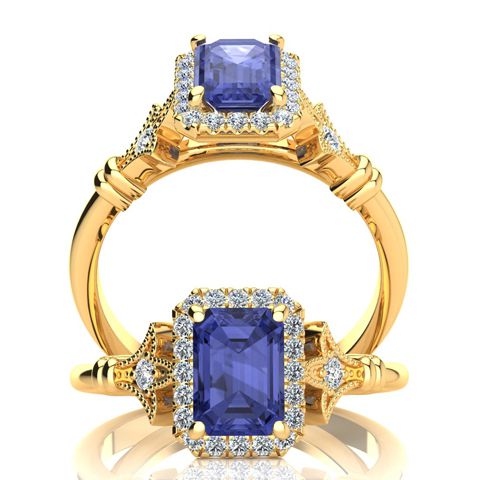 This stunning gemstone and halo diamond vintage ring features one 7x5mm emerald cut tanzanite gemstone at 1.15 carats. It is surrounded by 22 sparkling diamonds in a halo and down the band in H-I color, I1-I2 clarity at 0.25 carats. Total gem weight is 1.40 carats. This ring is crafted in 14 karat yellow gold.