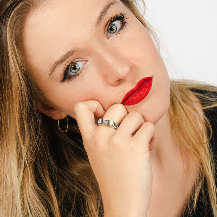 Love the ring and the entire experience. One thing to note about the ring, the middle diamond appears much larger than side diamonds in the picture but appears only slightly larger in person.--velvetb5.