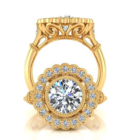 This vintage diamond engagement ring features a sparkling 1 1/4 carat center diamond in H-I color, SI2-I1 clarity. It is accented with 24 side diamonds at 0.29 carats. Total diamond weight is 1.54 carats. This ring is in 14 karat yellow gold.