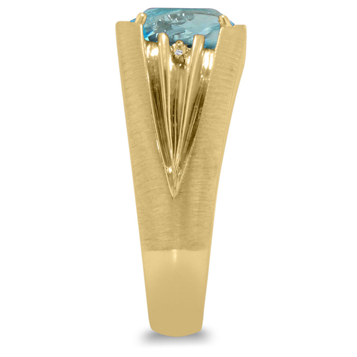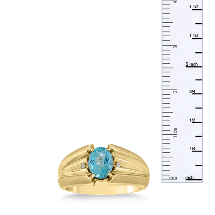 Beautiful oval cut Blue Topaz and diamond men's gemstone ring set in 14k yellow gold. The oval cut Blue Topaz is 1.50 carats. Total diamond weight is .01 carats, diamond color is I-J, diamond clarity is I2. Total gem weight is 1.51 carats. Available in ring sizes 8-12.5.