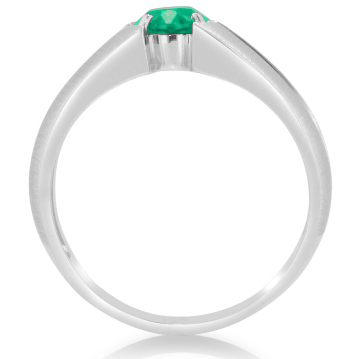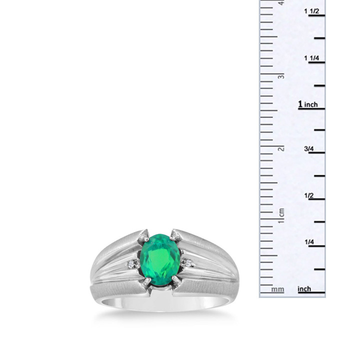 Beautiful oval cut created emerald and diamond men's gemstone ring set in 14k white gold. The oval cut created emerald is 1.50 carats. Total diamond weight is .01 carats, diamond color is I-J, diamond clarity is I2. Total gem weight is 1.51 carats. Available in ring sizes 8-12.5.