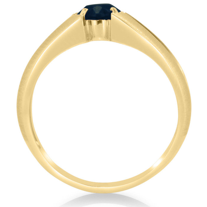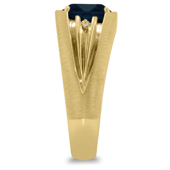 Beautiful oval cut created sapphire and diamond men's gemstone ring set in 10k yellow gold. The oval cut created sapphire is 1.50 carats. Total diamond weight is .01 carats, diamond color is I-J, diamond clarity is I2. Total gem weight is 1.51 carats. Available in ring sizes 8-12.5.