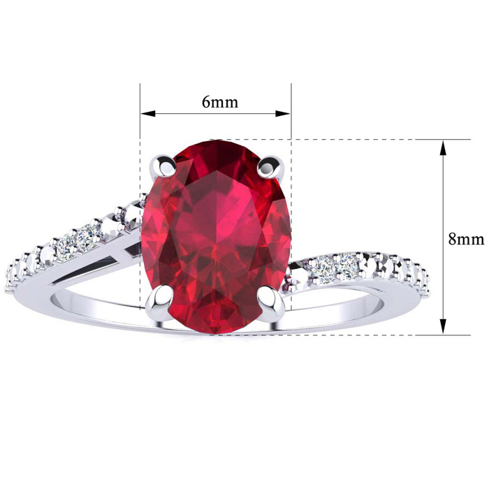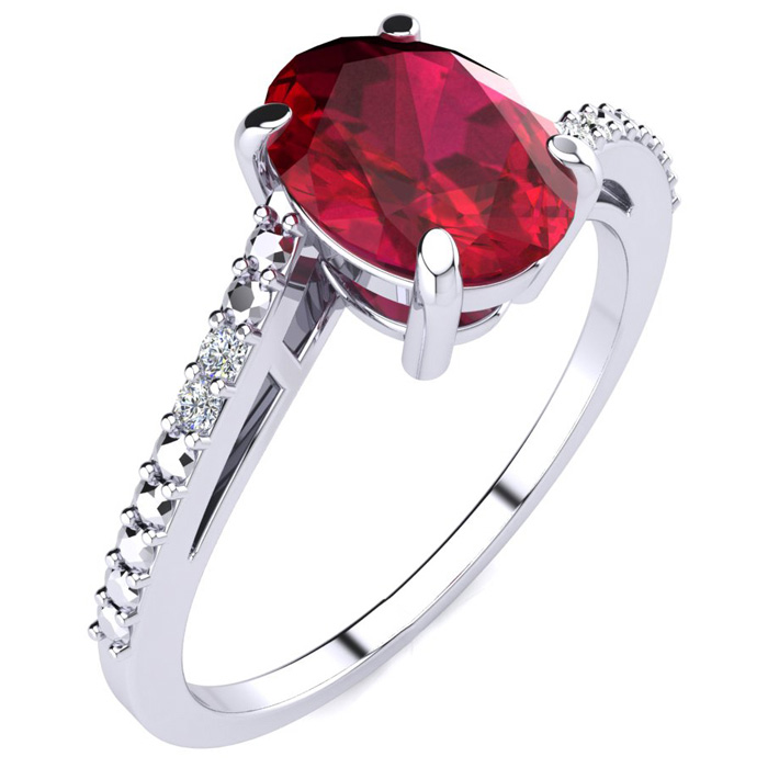 This classic gemstone ring features one 8x6mm oval shape ruby gemstone at approximately 1.55 carats. It is surrounded by 2 sparkling diamonds in I-J color, I1-I2 clarity at 0.01 carats. Total gem weight is approximately 1.56 carats. This ring is in 10 karat white gold.