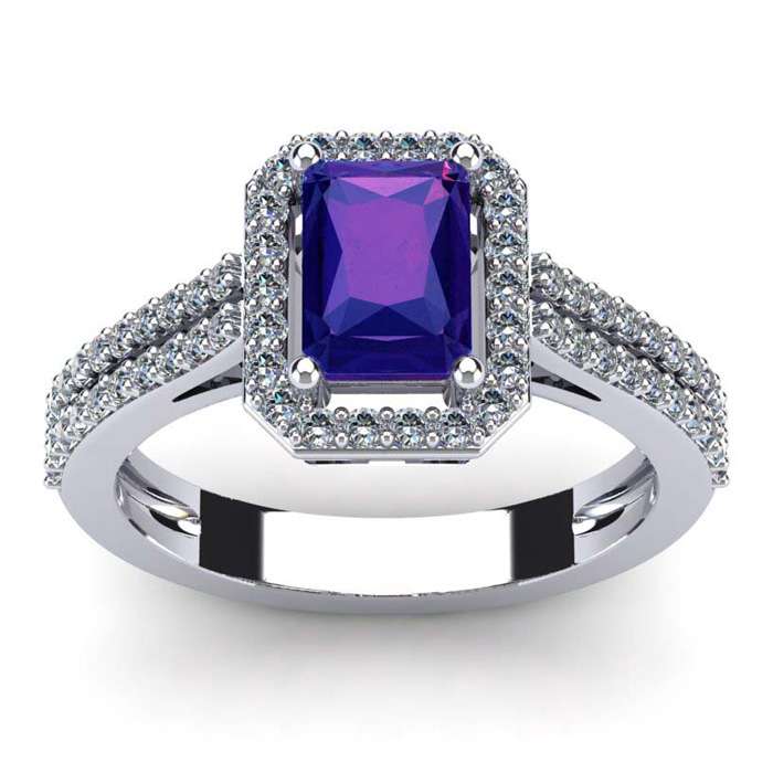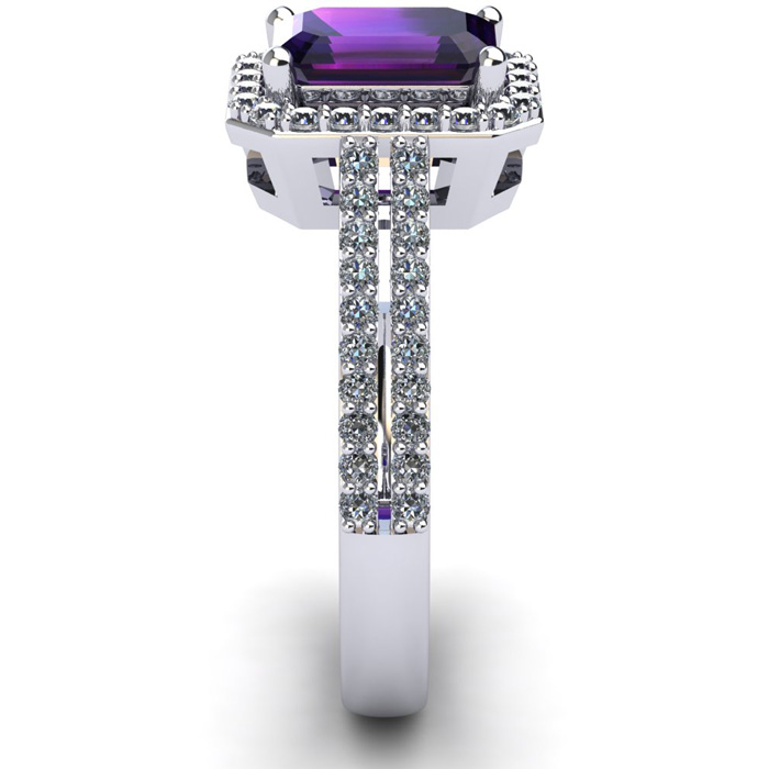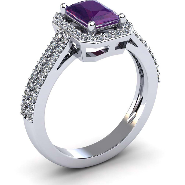 This stunning gemstone and diamond ring features one 7x5mm emerald cut amethyst gemstone at 0.90 carats. It is surrounded by 56 sparkling diamonds in a halo in I-J color, I1-I2 clarity at 0.42 carats. Total gem weight is 1.32 carats. This ring is crafted in 14 karat white gold.