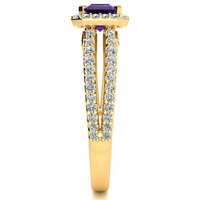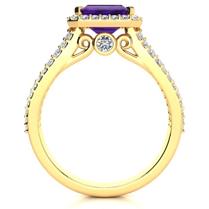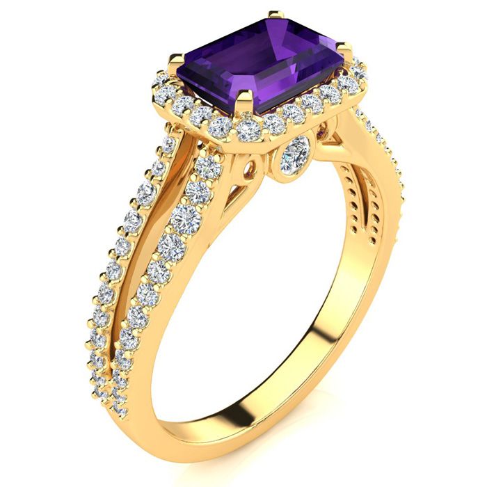 This stunning gemstone and halo diamond ring features one 7x5mm emerald shape amethyst gemstone at 0.90 carats. It is surrounded by 72 sparkling diamonds in a halo and down the band in H-I color, I1-I2 clarity at 0.42 carats. Total gem weight is 1.32 carats. This ring is crafted in 14 karat yellow gold.