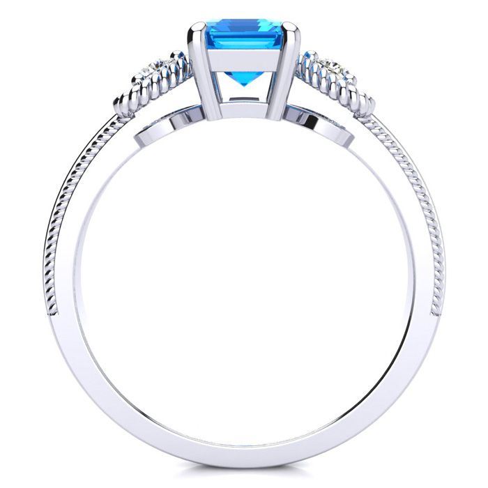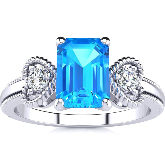 This stunning gemstone and diamond ring features one 7x5mm emerald cut blue topaz gemstone at 1.20 carats. It is surrounded by 2 sparkling diamonds in a heart in I-J color, I1-I2 clarity at 0.12 carats. Total gem weight is 1.32 carats. This ring is crafted in 10 karat white gold.