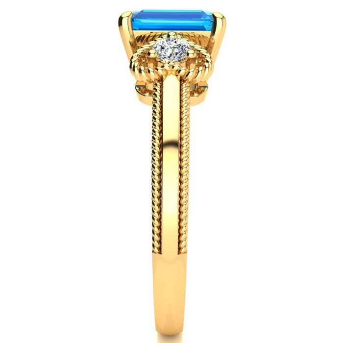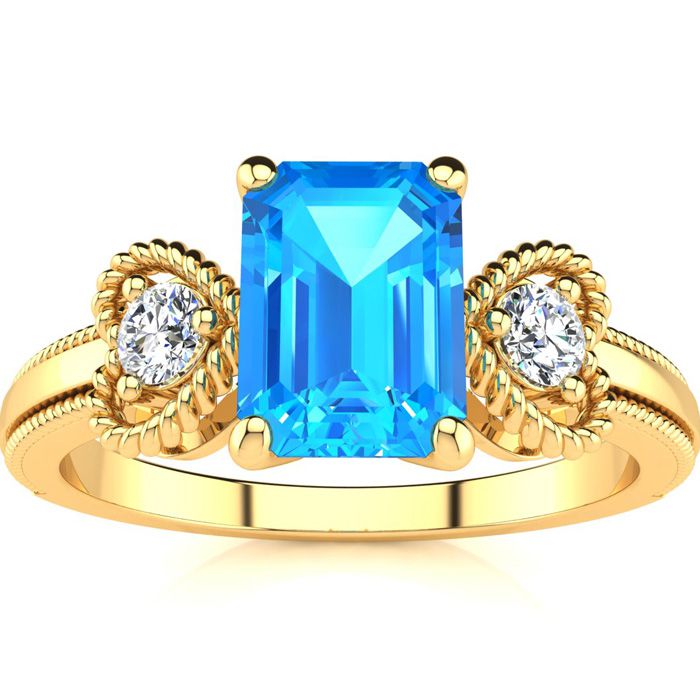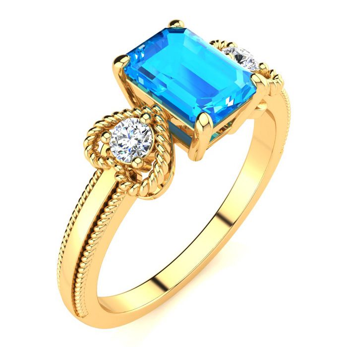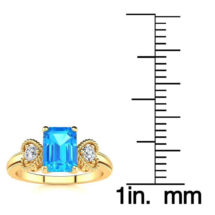 This stunning gemstone and diamond ring features one 7x5mm emerald cut blue topaz gemstone at 1.20 carats. It is surrounded by 2 sparkling diamonds in a heart in I-J color, I1-I2 clarity at 0.12 carats. Total gem weight is 1.32 carats. This ring is crafted in 10 karat yellow gold.