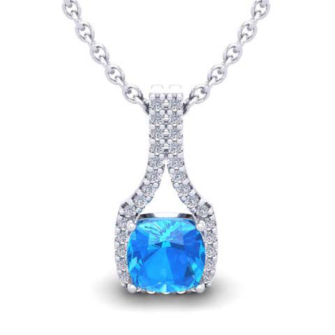 This stunning gemstone and halo diamond necklace features one 6x6mm cushion cut blue topaz gemstone at 1.15 carats. It is surrounded by 39 sparkling diamonds in a halo in I-J color, SI2-I1 clarity at 0.20 carats. Total gem weight is 1.35 carats. This necklace is crafted in 14 karat white gold and comes with an 18 inch cable chain with spring-ring clasp.