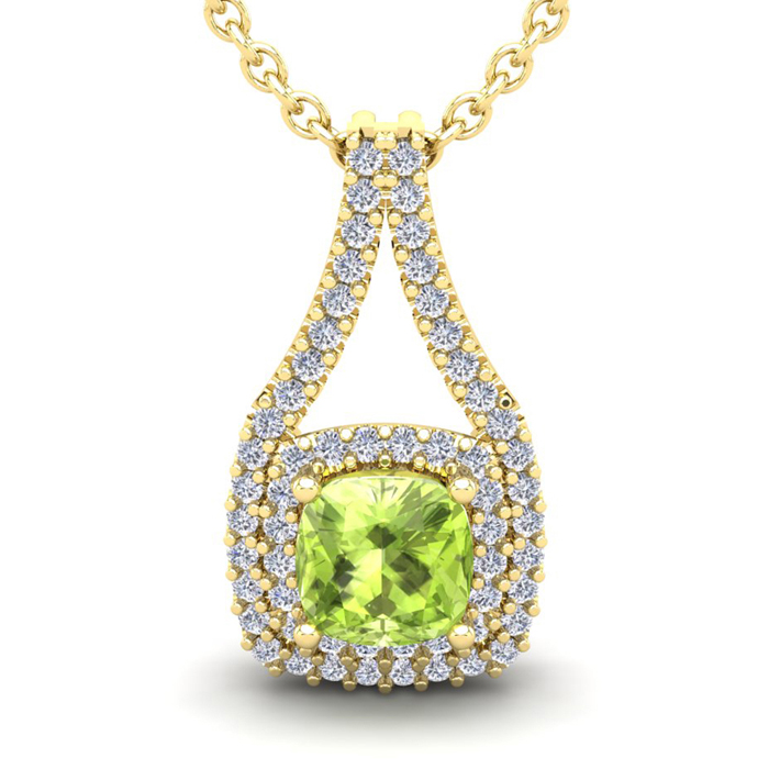 This stunning gemstone and halo diamond necklace features one 6x6mm cushion cut peridot gemstone at 1.08 carats. It is surrounded by 62 sparkling diamonds in a halo in I-J color, SI2-I1 clarity at 0.31 carats. Total gem weight is 1.39 carats. This necklace is crafted in 14 karat yellow gold and comes with an 18 inch cable chain with spring-ring clasp.