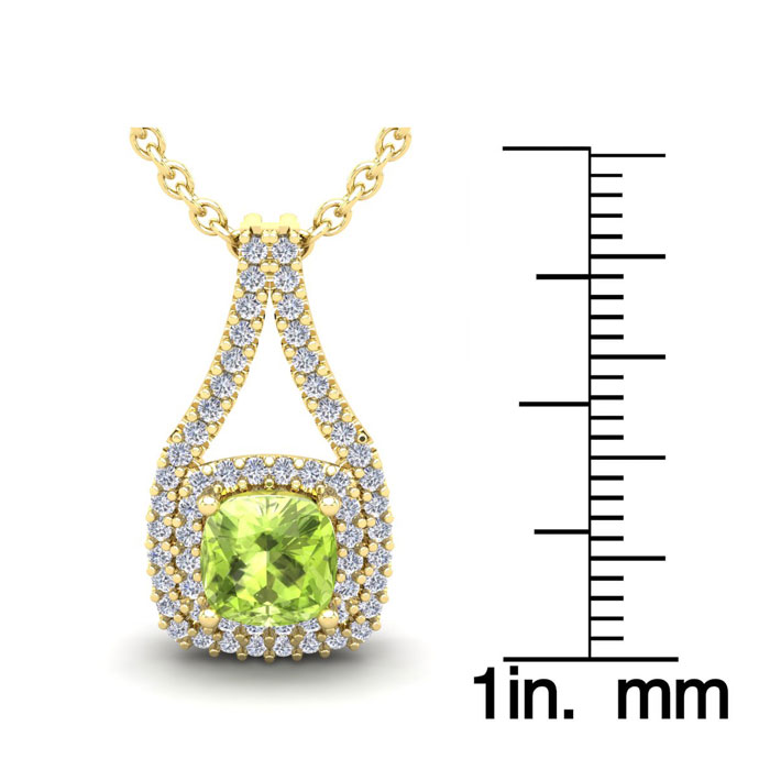 1 1/3 Carat Cushion Cut Peridot and Double Halo Diamond Necklace In 14 Karat Yellow Gold, 18 Inches