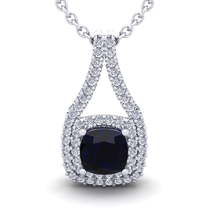 1 1/3 Carat Cushion Cut Sapphire and Double Halo Diamond Necklace In 14 Karat White Gold, 18 Inches