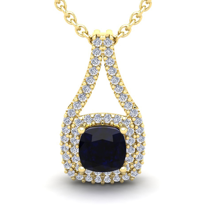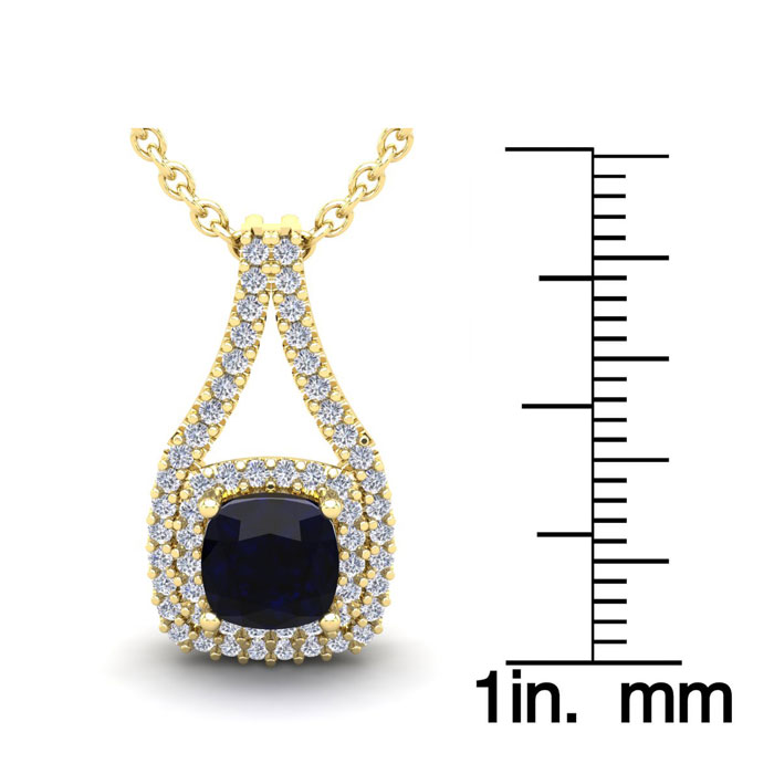 1 1/3 Carat Cushion Cut Sapphire and Double Halo Diamond Necklace In 14 Karat Yellow Gold, 18 Inches