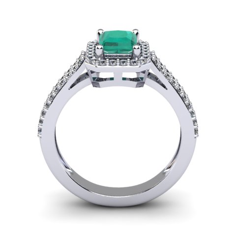 This stunning gemstone and diamond ring features one 7x5mm emerald cut emerald gemstone at 0.90 carats. It is surrounded by 56 sparkling diamonds in a halo in I-J color, I1-I2 clarity at 0.42 carats. Total gem weight is 1.32 carats. This ring is crafted in 14 karat white gold.
