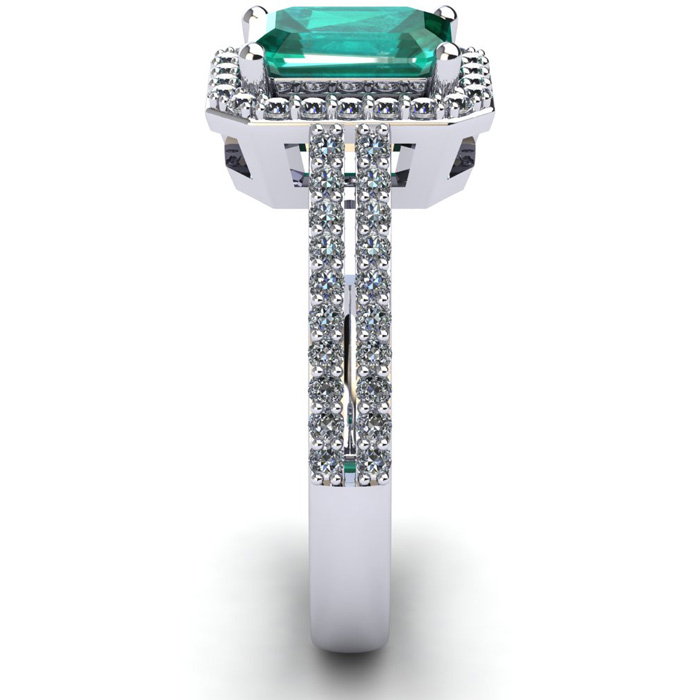 This stunning gemstone and diamond ring features one 7x5mm emerald cut emerald gemstone at 0.90 carats. It is surrounded by 56 sparkling diamonds in a halo in I-J color, I1-I2 clarity at 0.42 carats. Total gem weight is 1.32 carats. This ring is crafted in 14 karat white gold.