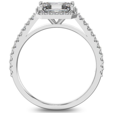 This classic engagement ring stuns with an emerald shape center diamond. The center diamond measures approximately 7x5mm at 1.00 carats. It is clarity enhanced in H-I color. It is surrounded by 42 diamonds in a halo and along the band totaling at 0.31 carats in H-I color, SI1-SI2 clarity. Total gem weight of the ring is approximately 1.31 carats. This ring is in 14 karat white gold.