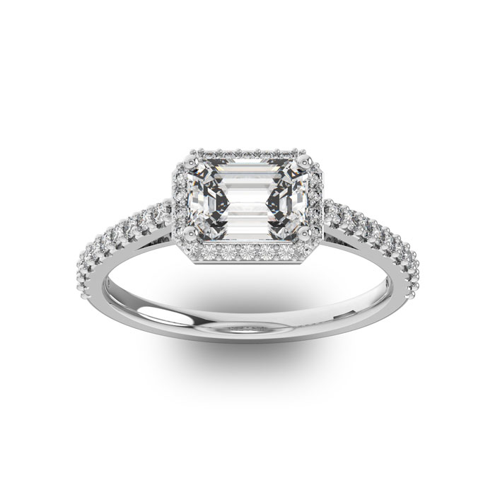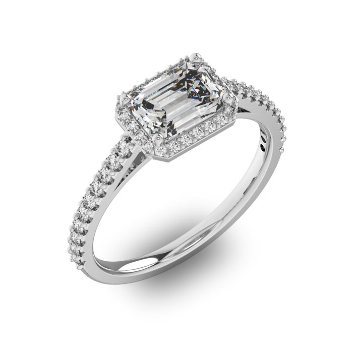 This classic engagement ring stuns with an emerald shape center diamond. The center diamond measures approximately 7x5mm at 1.00 carats. It is clarity enhanced in H-I color. It is surrounded by 42 diamonds in a halo and along the band totaling at 0.31 carats in H-I color, SI1-SI2 clarity. Total gem weight of the ring is approximately 1.31 carats. This ring is in 14 karat white gold.