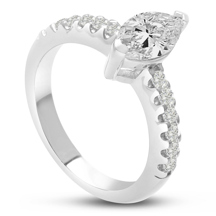 Marquise cut stones are extremely unique and appear larger at first glance, this ring is super firey and sparkles from every angle with round brilliant stones going down the band, this ring is truly a show stopper!