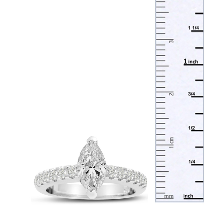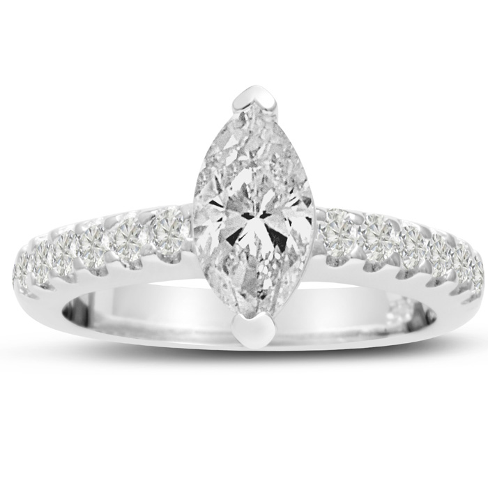 Marquise cut stones are extremely unique and appear larger at first glance, this ring is super firey and sparkles from every angle with round brilliant stones going down the band, this ring is truly a show stopper!