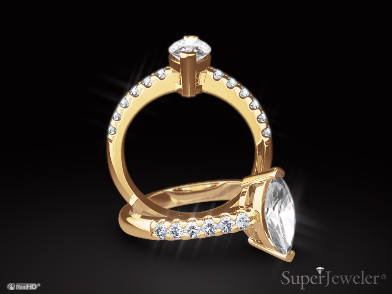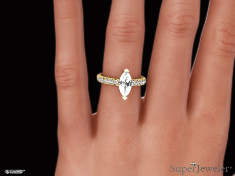 For a classically beautiful diamond engagement ring, try this engagement ring crafted in 14 karat yellow gold. This ring boasts a 1 carat marquise shape center diamond that has been clarity enhanced with accent diamonds along the shank. The ring has a total diamond weight of 1 1/2 carats. There are 13 diamonds total in I-J color and I1-I2 clarity.