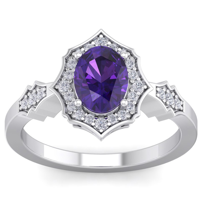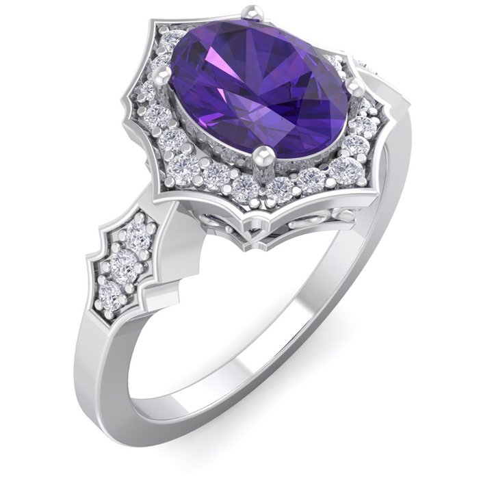 This elegant gemstone ring features one 8x6mm oval shape amethyst gemstone at approximately 1.05 carats. It is surrounded by 26 sparkling diamonds in I-J color, I1-I2 clarity at 1/4 carat total weight. Total gem weight is approximately 1 1/3 carat total weight. This ring is in 14 karat white gold.