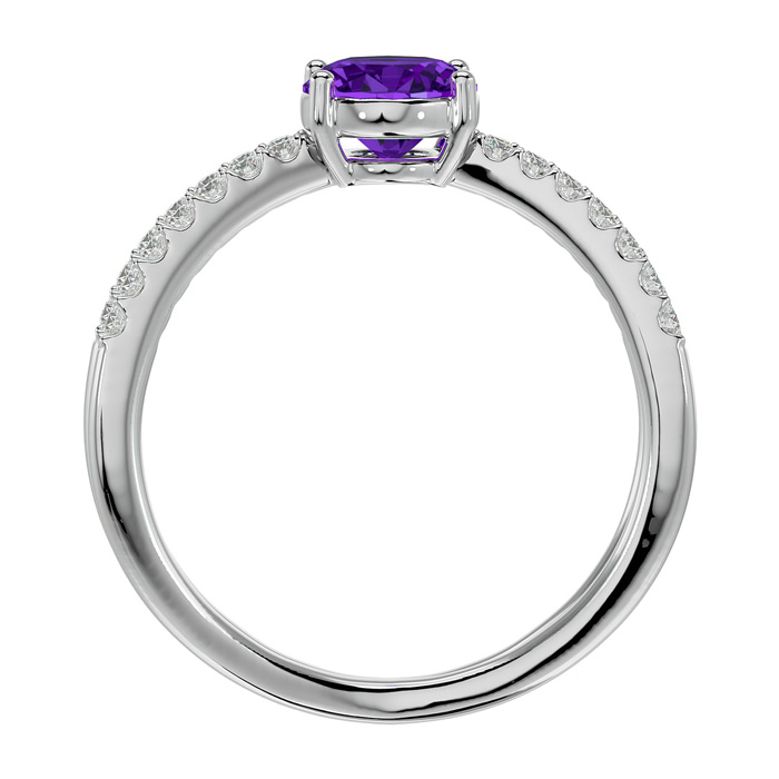 This elegant gemstone ring features one 8x6mm oval shape amethyst gemstone at approximately 1.05 carats. It is surrounded by 28 sparkling diamonds in I-J color, I1-I2 clarity at 1/4 carat total weight. Total gem weight is approximately 1 1/3 carats. This ring is in 14 karat white gold.