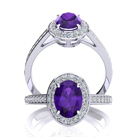 This stunning gemstone and diamond ring features one 8x6mm oval shape amethyst gemstone at 1.05 carats. It is surrounded by 34 sparkling diamonds in a halo in I-J color, I1-I2 clarity at 0.26 carats. Total gem weight is 1.31 carats. This ring is crafted in 14 karat white gold.