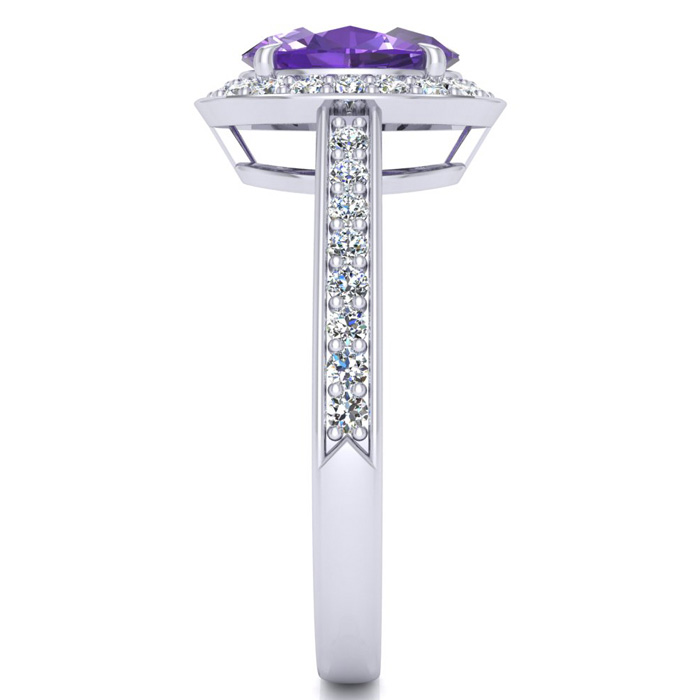 This stunning gemstone and diamond ring features one 8x6mm oval shape amethyst gemstone at 1.05 carats. It is surrounded by 34 sparkling diamonds in a halo in I-J color, I1-I2 clarity at 0.26 carats. Total gem weight is 1.31 carats. This ring is crafted in 14 karat white gold.