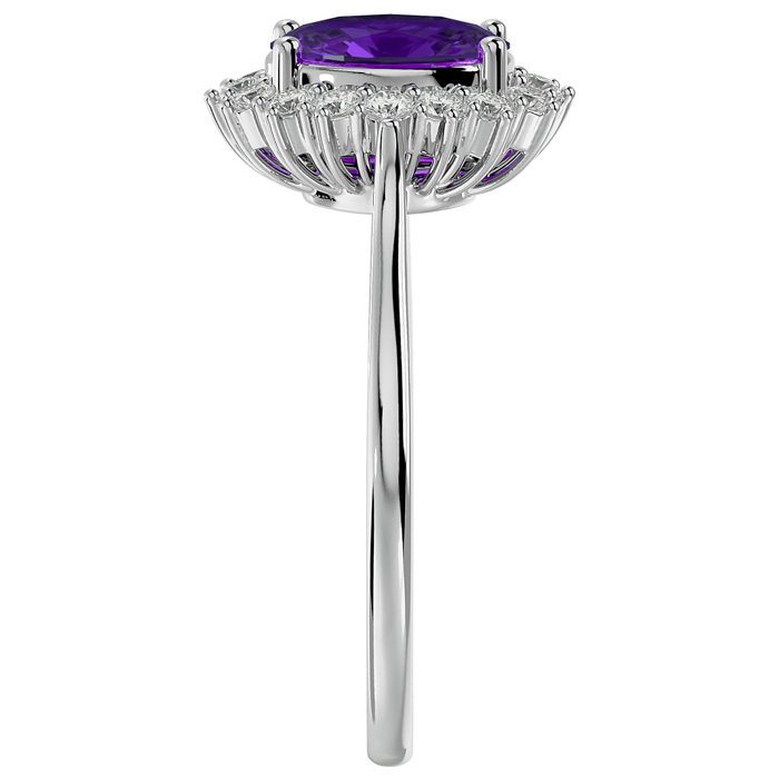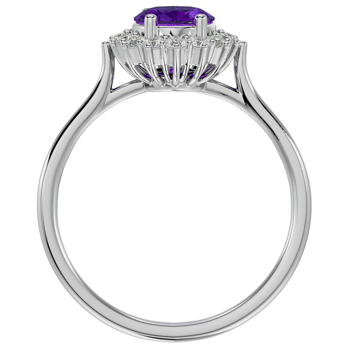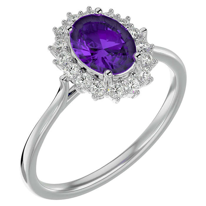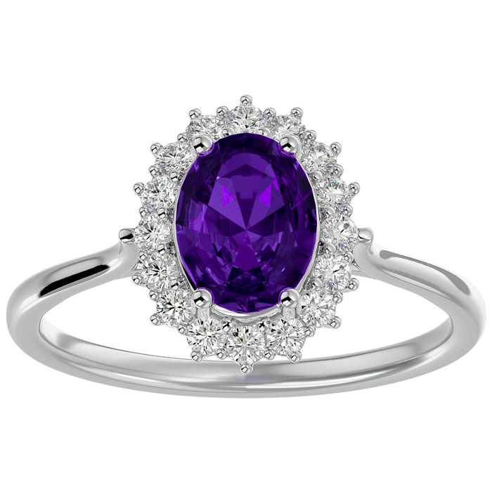 This elegant gemstone ring features one 8x6mm oval shape amethyst gemstone at approximately 1.05 carats. It is surrounded by 16 sparkling diamonds in I-J color, I1-I2 clarity at 1/4 carat total weight. Total gem weight is approximately 1 1/3 carats. This ring is in 14 karat white gold.