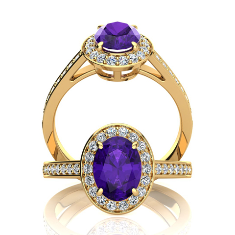 This stunning gemstone and diamond ring features one 8x6mm oval shape amethyst gemstone at 1.05 carats. It is surrounded by 34 sparkling diamonds in a halo in I-J color, I1-I2 clarity at 0.26 carats. Total gem weight is 1.31 carats. This ring is crafted in 14 karat yellow gold.