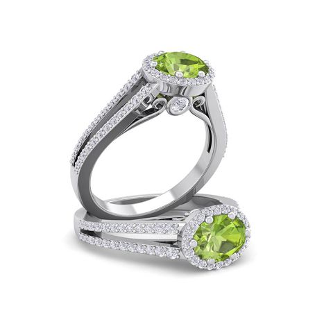 This stunning gemstone and halo diamond ring features one 7x5mm oval shape peridot gemstone at 0.90 carats. It is surrounded by 70 sparkling diamonds in a halo and down the band in H-I color, I1-I2 clarity at 0.41 carats. Total gem weight is 1.31 carats. This ring is crafted in 14 karat white gold.