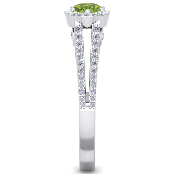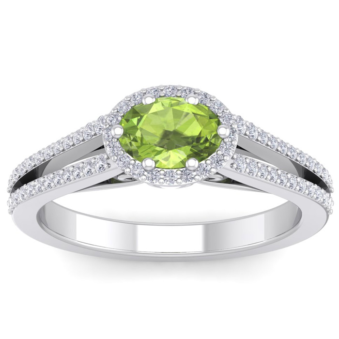 This stunning gemstone and halo diamond ring features one 7x5mm oval shape peridot gemstone at 0.90 carats. It is surrounded by 70 sparkling diamonds in a halo and down the band in H-I color, I1-I2 clarity at 0.41 carats. Total gem weight is 1.31 carats. This ring is crafted in 14 karat white gold.