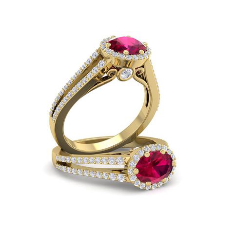 This stunning gemstone and halo diamond ring features one 7x5mm oval shape ruby gemstone at 0.95 carats. It is surrounded by 70 sparkling diamonds in a halo and down the band in H-I color, I1-I2 clarity at 0.41 carats. Total gem weight is 1.36 carats. This ring is crafted in 14 karat yellow gold.