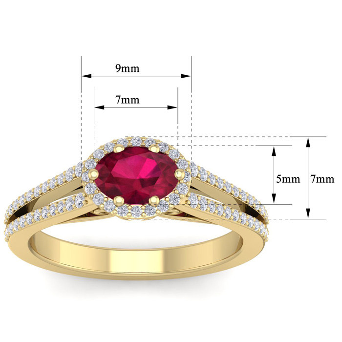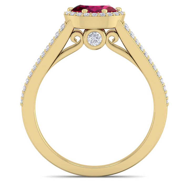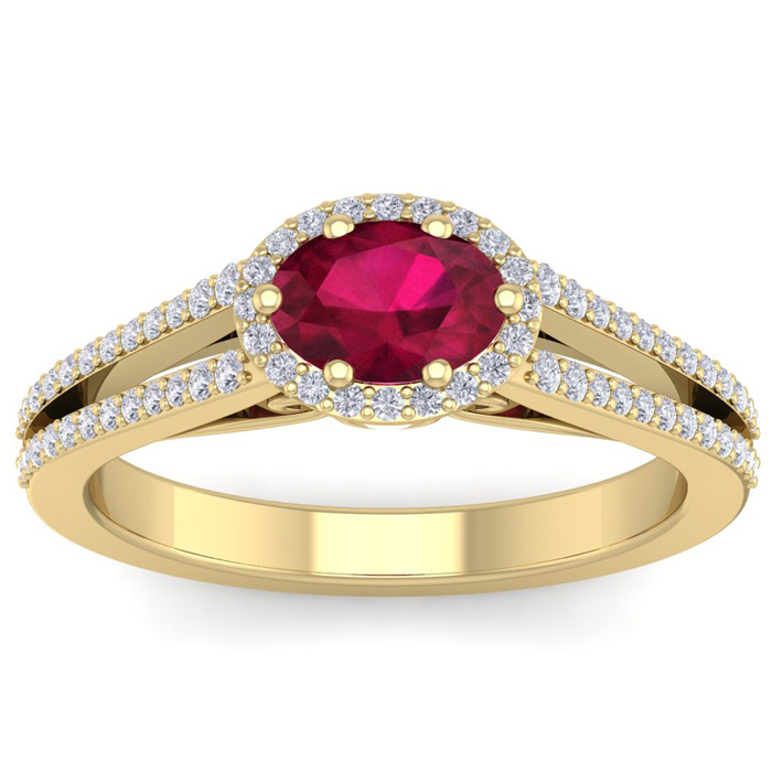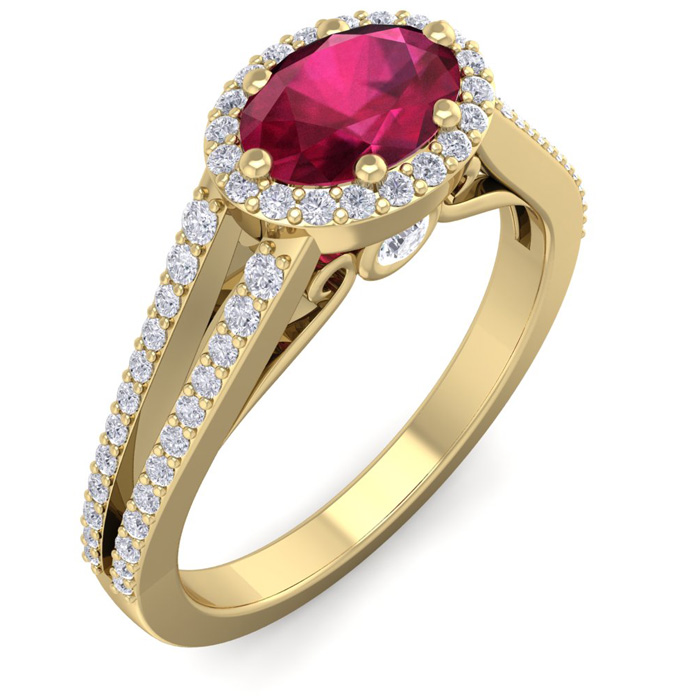 This stunning gemstone and halo diamond ring features one 7x5mm oval shape ruby gemstone at 0.95 carats. It is surrounded by 70 sparkling diamonds in a halo and down the band in H-I color, I1-I2 clarity at 0.41 carats. Total gem weight is 1.36 carats. This ring is crafted in 14 karat yellow gold.