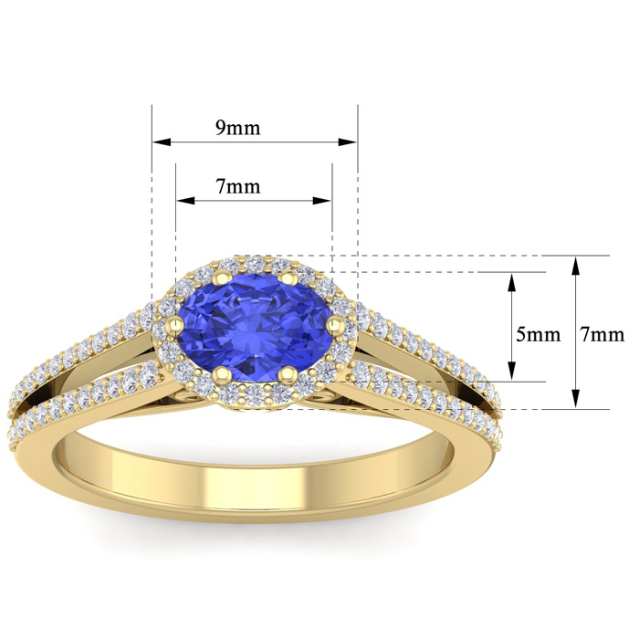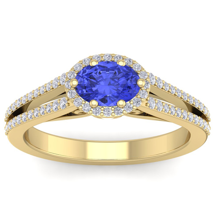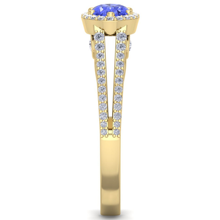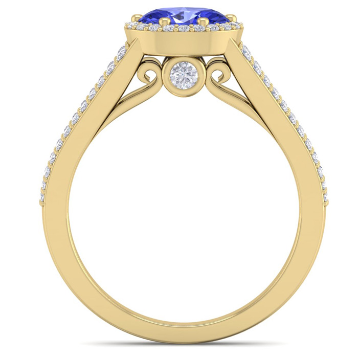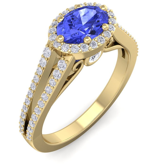 This stunning gemstone and halo diamond ring features one 7x5mm oval shape tanzanite gemstone at 0.95 carats. It is surrounded by 70 sparkling diamonds in a halo and down the band in H-I color, I1-I2 clarity at 0.41 carats. Total gem weight is 1.36 carats. This ring is crafted in 14 karat yellow gold.