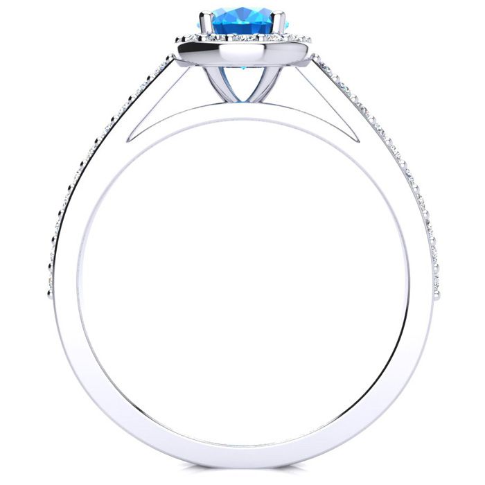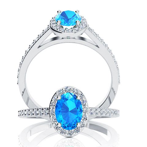 This stunning gemstone and halo diamond ring features one 7x5mm oval shape blue topaz gemstone at 1.00 carats. It is surrounded by 38 sparkling diamonds in a halo and down the band in H-I color, I1-I2 clarity at 0.29 carats. Total gem weight is 1.29 carats. This ring is crafted in 14 karat white gold.