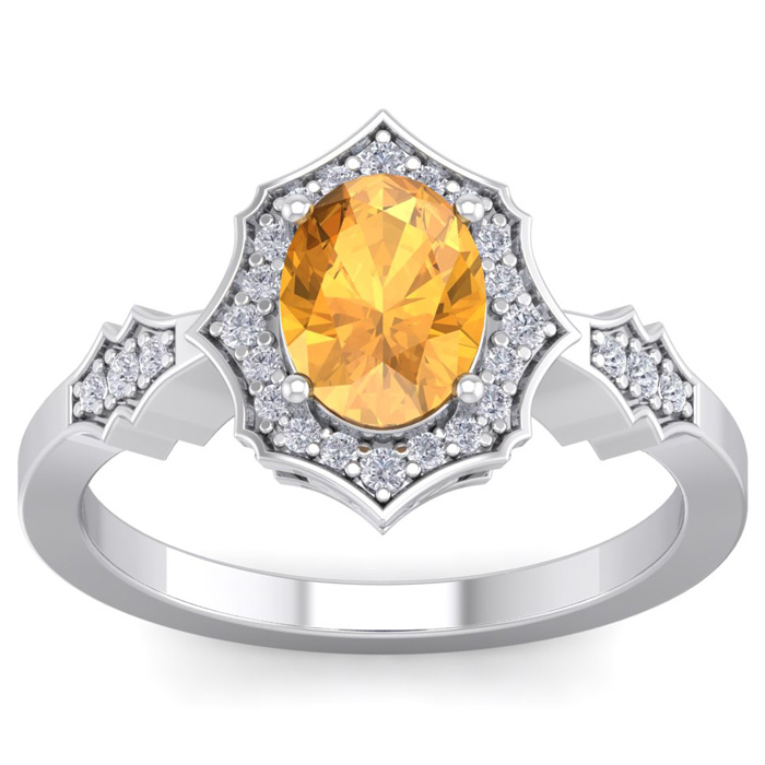 This elegant gemstone ring features one 8x6mm oval shape citrine gemstone at approximately 1.05 carats. It is surrounded by 26 sparkling diamonds in I-J color, I1-I2 clarity at 1/4 carat total weight. Total gem weight is approximately 1 1/3 carat total weight. This ring is in 14 karat white gold.