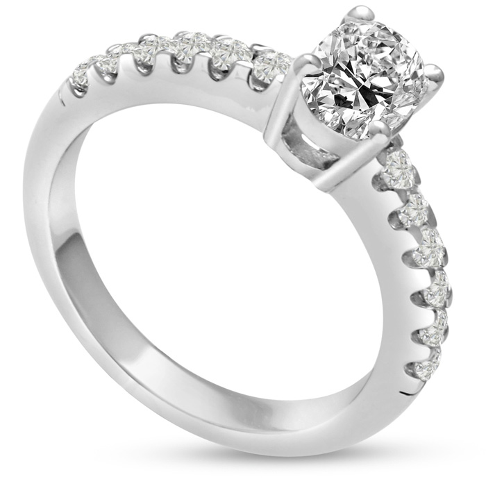 Oval cut stones are extremely unique and appear larger at first glance, this ring is sure to sparkle from all angles with round brilliant stones going down the band, this is truly a show stopper!
