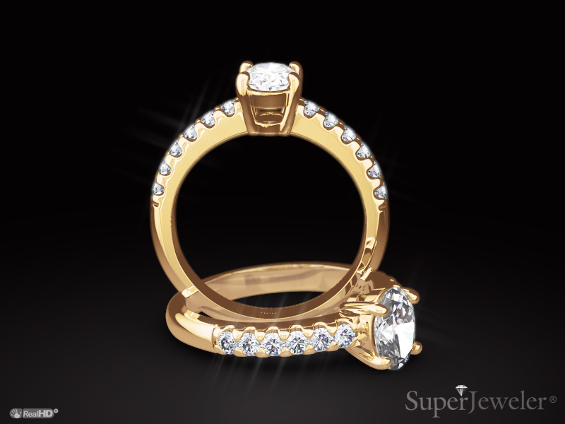 For a classically beautiful diamond engagement ring, try this engagement ring crafted in 14 karat yellow gold. This ring boasts a 1 carat oval shaped center diamond with accent diamonds along the shank. The ring has a total diamond weight of 1.36 carats. There are 13 diamonds total in H-I color and SI2-I1 clarity.