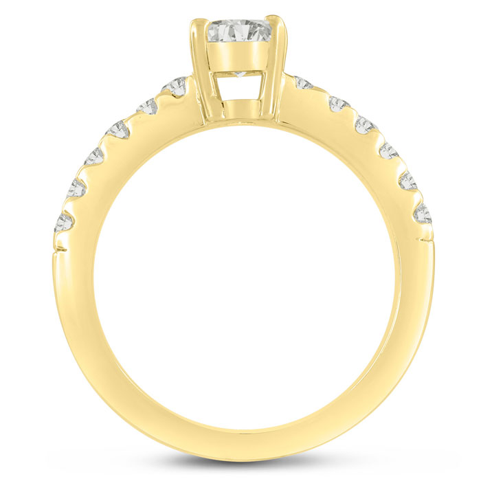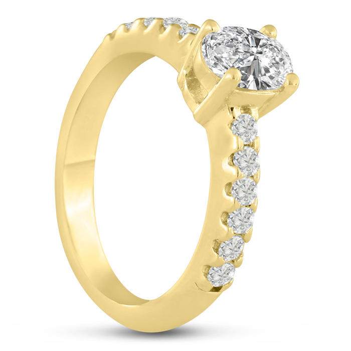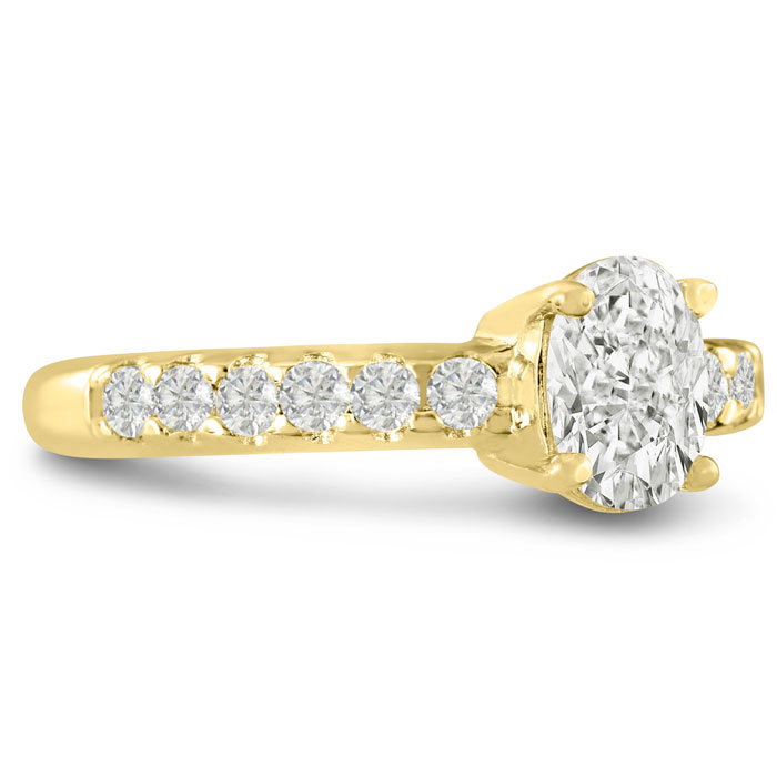 For a classically beautiful diamond engagement ring, try this engagement ring crafted in 14 karat yellow gold. This ring boasts a 1 carat oval shaped center diamond with accent diamonds along the shank. The ring has a total diamond weight of 1.36 carats. There are 13 diamonds total in H-I color and SI2-I1 clarity.