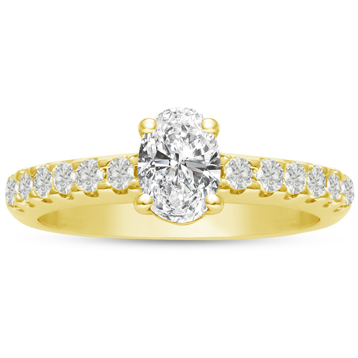 For a classically beautiful diamond engagement ring, try this engagement ring crafted in 14 karat yellow gold. This ring boasts a 1 carat oval shaped center diamond that has been clarity enhanced with accent diamonds along the shank. The ring has a total diamond weight of 1 1/2 carats. There are 13 diamonds total in I-J color and I1-I2 clarity.