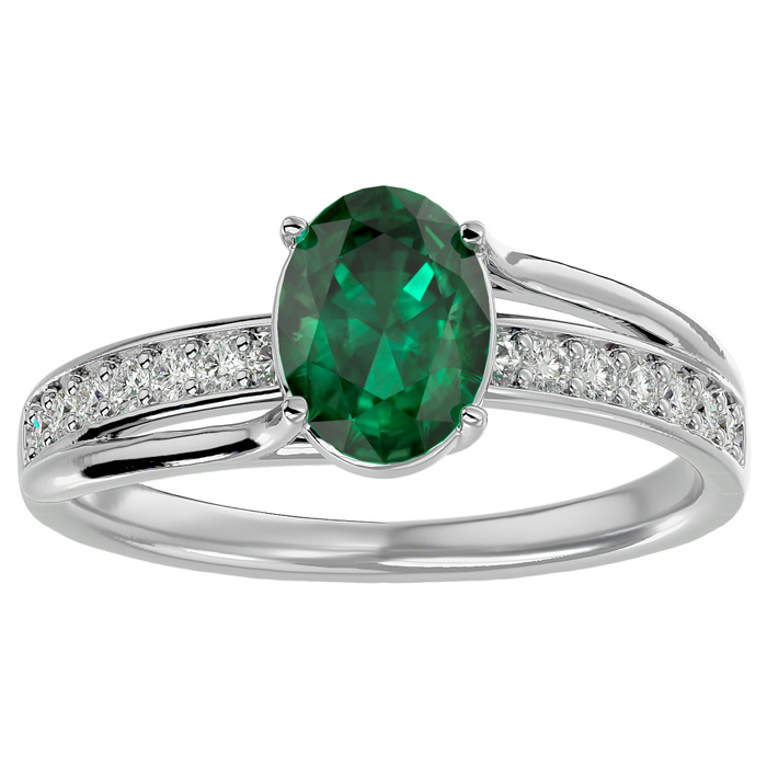 This elegant gemstone ring features one 8x6mm oval shape emerald gemstone at approximately 1.15 carats. It is surrounded by 14 sparkling diamonds in I-J color, I1-I2 clarity at 1/5 carat total weight. Total gem weight is approximately 1 1/3 carats. This ring is in 14 karat white gold.