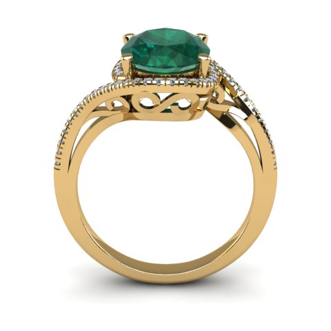 This stunning gemstone and halo diamond ring features one 8x6mm oval shape emerald gemstone at 1.15 carats. It is surrounded by 48 sparkling diamonds in a halo and down the band in H-I color, I1-I2 clarity at 0.24 carats. Total gem weight is 1.39 carats. This ring is crafted in 14 karat yellow gold.