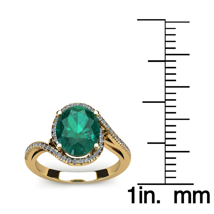 This stunning gemstone and halo diamond ring features one 8x6mm oval shape emerald gemstone at 1.15 carats. It is surrounded by 48 sparkling diamonds in a halo and down the band in H-I color, I1-I2 clarity at 0.24 carats. Total gem weight is 1.39 carats. This ring is crafted in 14 karat yellow gold.