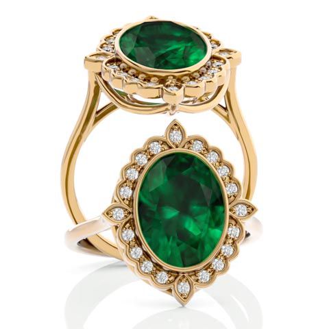 1 1/3 Carat Oval Shape Emerald and Halo Diamond Ring In 14 Karat Yellow Gold